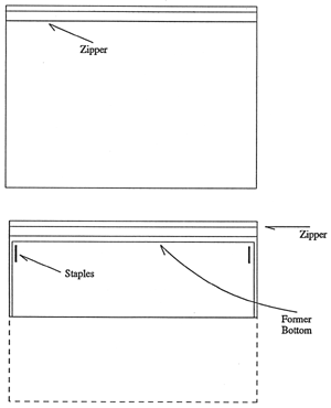 Small pieces of material are easily removed since the opening is large and the bag is shallow. Nothing is inserted or removed "against the grain". Both operations are done from one side. Rights and lefts or rights and pieces of the same can be stored separately in the same bag. A 12" x 12" bag treated this way becomes a "pair" of 12" x 6" bags. It will hold 2 capes or a cape and saddle in half of the size they will need for separate storage.