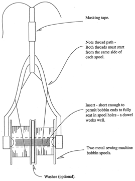 The change made is in the number of spools used; in place of one there are two. These are standard metal sewing machine bobbin spools (they come in both metal and plastic - I prefer metal). Thompson Monobond 3/0 and 6/0 and floss are loaded on them. The spools themselves are available in yard good stores and sewing centers. Monobond is available in fly shops. Unless you want to use the Thompson product, their spools must be emptied or you must purchase empty spools and fill them using a sewing machine or electric drill. The Thompson spool is excellent and may be available from them (D.H. Thompson, 11 North Union St., Elgin, Ill. 60123), they are the manufacturers of the world famous Model A vise and other fine tools. In some mail order catalogues these spools have been called midge spools although I have no idea why.