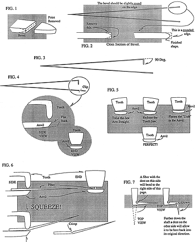 "3. Squeeze the tweezers together and clip the underjaw back to the outside of the tooth. Then with a file bevel the underjaw - the "anvil" - back until the upper edge is just beyond flush with the outside of the tooth (Fig. 4). Using very fine (400 grit) emery, put it between the tooth and anvil and pull it through them. Do this 3 or 4 times with the grit on the tooth side and then 3 or 4 times with the grit on the anvil side. Don't squeeze the jaws together too hard or the tooth will tear the paper. However, apply enough pressure to cause abrasion. The edge on the tooth will flatten a little, restore it to its rounded bevel. The emery "wears" the jaws together.
