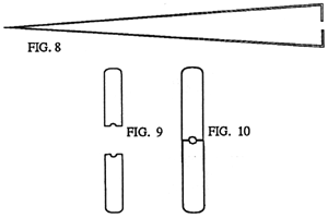 Check the tying tips column in the Winter, 1989 issue of Fly Tyer Magazine (now American Angler and a shadow of its former self). You will find instructions for making a hair packer out of a pair of tweezers. Actually, when I submitted the article I used the (perfectly legitimate) term forceps. This lead to much confusion on the part of the editor who confused forceps with hemostats, thus confusing the readership. I even sent drawings, as editors are easily confused (except of course you, Mike) (You don't know me very well, Marv! - Ed.). All of this confusion was corrected when the same tool appeared in Fly-Tying Tips (1990, Dick Stewart). If you cannot find the magazine or the book, find another pair of forceps, pardon me, tweezers, and modify them as follows: bend both squared off tips toward each other at right angle (figure 8). File a notch in both tips (figure 9). The notches in my model form a hole of about one sixteenth inch when the tips are pressed together (figure 10). Dress and smooth the tips and notches.