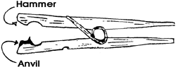 This little tool can nut just the right finishing touch on your Indian Crow subs by crimping the tips of whatever feather you use. The anvil is a small piece of closed cell foam glued to one jaw of the clothespin. The hammer has been shaped with small files. Some trial and error is involved here.