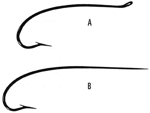 Diagram "A" shows a typical hook before reworking.