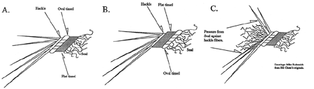 | I experimented a bit by tying a spey fly with a seal body. I tied in a flat tinsel, then an oval tinsel followed lastly by the body hackle. This was done to lessen the influence of the seal by keeping it as far as possible from the left side of the hackle. The pressure, if any, from the seal is now from the right of the hackle.