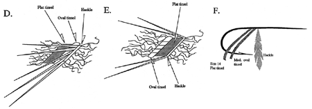 Another method of ribbing a seal body is: oval tinsel, flat tinsel and lastly, on the right, the body hackle. I tied a full-dressed fly using this sequence and it worked well. Do I even have to say this? See Dia. E.
