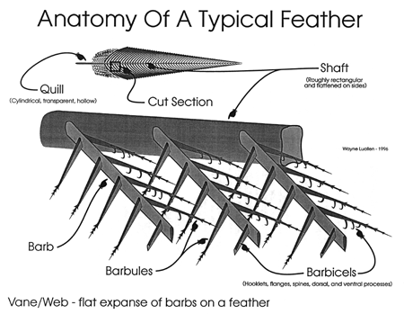 An important aspect of fly tying is sharing information. In turn it behooves us as fly tiers to speak the same language. We have all read fly patterns that refer to "quills," "barbs," "barbules," "fibers," "shafts," "stems," "vanes," and so forth, but when we read these terms do we know what they have reference to? We may, but what about the author; did he truly describe by name what he intended? How often have we read "quill" when in fact what was referred to was actually a "barb" or perhaps "shaft?" How often have we read "fibers" when the author meant "barbs" or perhaps "barbules?" How often have we read "barbs," "barbules," "fibers," or even "barbels" (which are tactile processes on the lips of a fish rather than components of a feather) when referring to a feather's ability to marry, but in actuality "barbicels" or perhaps more specifically "hooklets" is what was meant? If we spoke the same language we would better comprehend what was intended. It may not be necessary to know scientific names, but if we wish to communicate, we need to have standards.