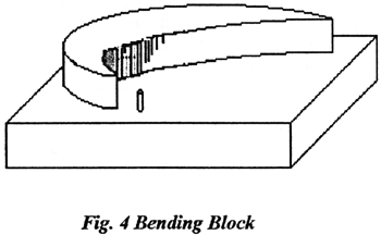 I use such a template cut and filed into shape out of a block of aluminium bar stock (see Fig. 4). The advantage of using this method compared to bending a flat piece of steel into shape and trying to center it in a wooden block is obvious. Using an aluminium block gives you the advantage of being able to file on and on until you reach the right shape. Often you need to over bend the wire to get the exact hook shape - depending on the hardness of the wire you use; this is the only trouble you will encounter, but nevertheless it can be quite time consuming. No advice can be offered because we will never use the same steel - so just keep filing! Eventually you will learn that the "overbend" will be most apparent from the last part of the bend through to the shank. Oh, just one little piece of advice: If you move to a new wire stock or different maker, the softness of the wire will be different - and so, you'll have start all over again with filing templates!